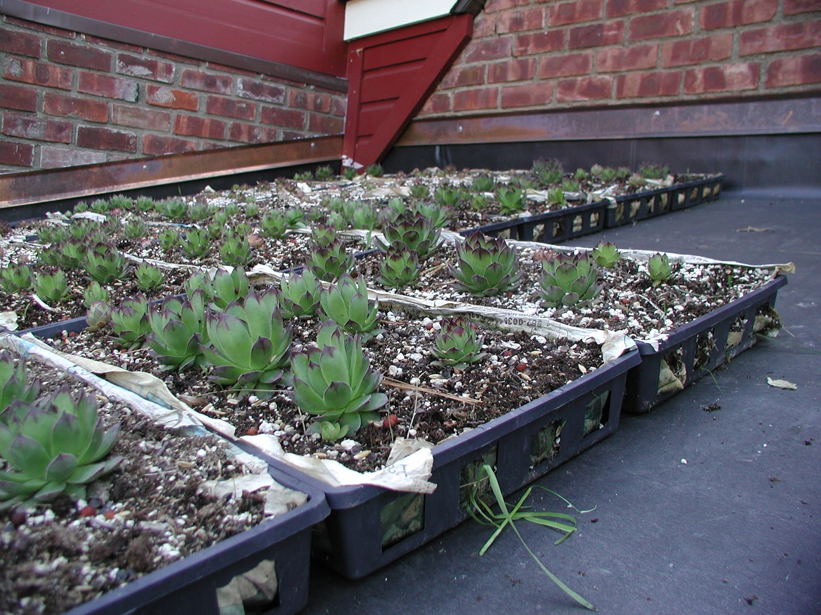 All this planting took place almost a year before the roof was readied for the plants, important so the hen-and-chicks could make enough “chicks” to spread and pretty much cover the planting trays, which otherwise would have left too much planting mix exposed to washing from rainfall.